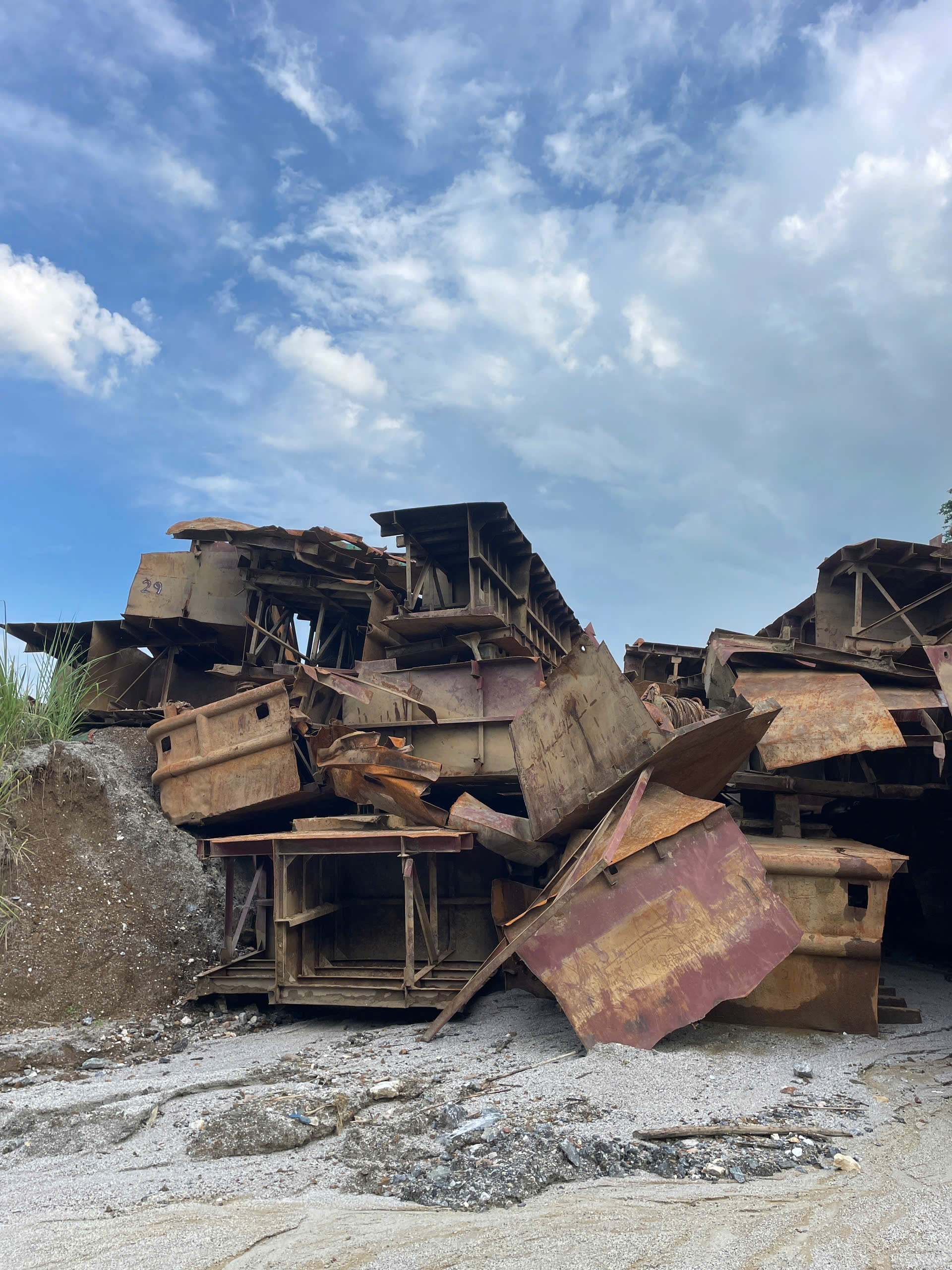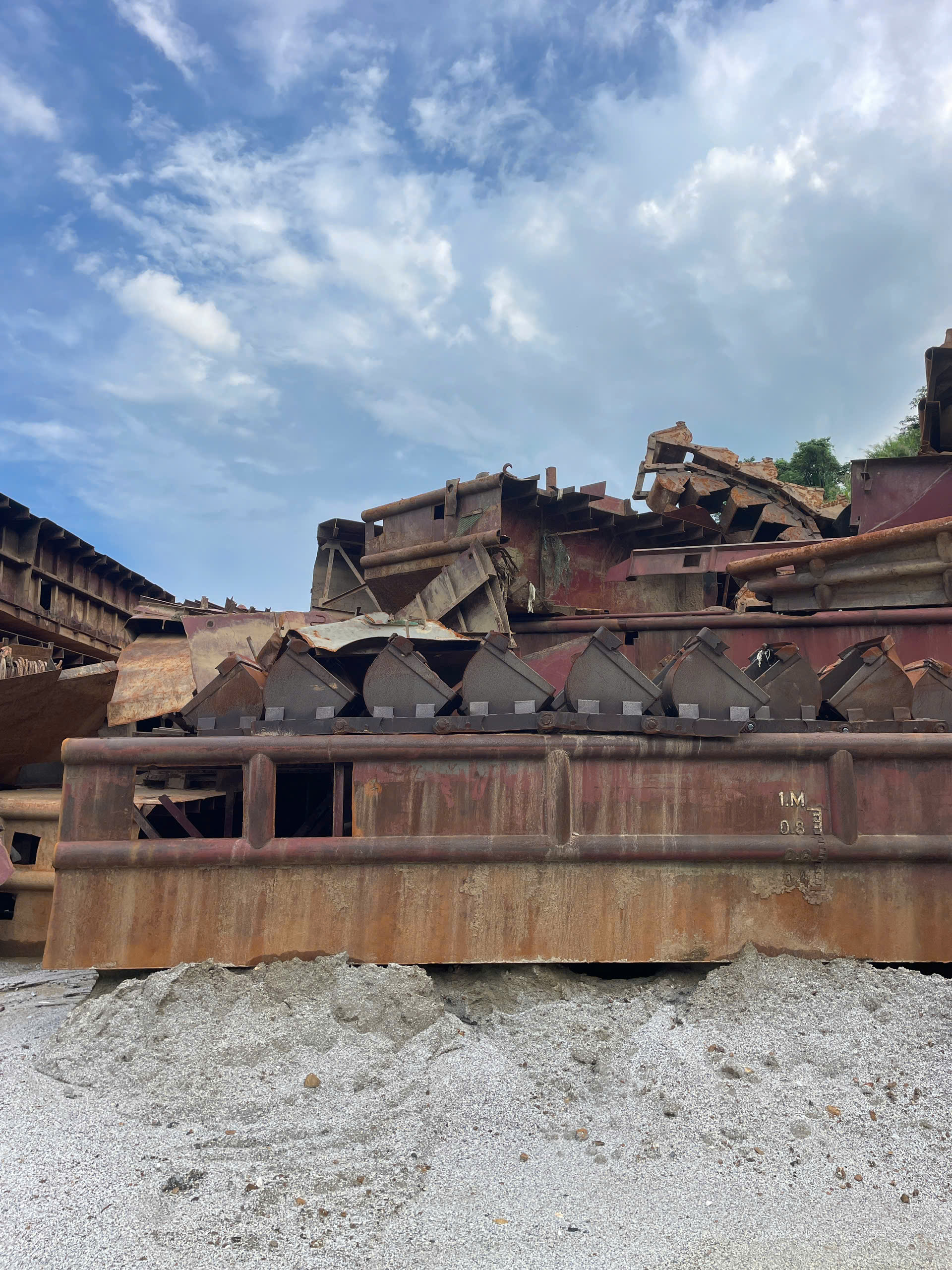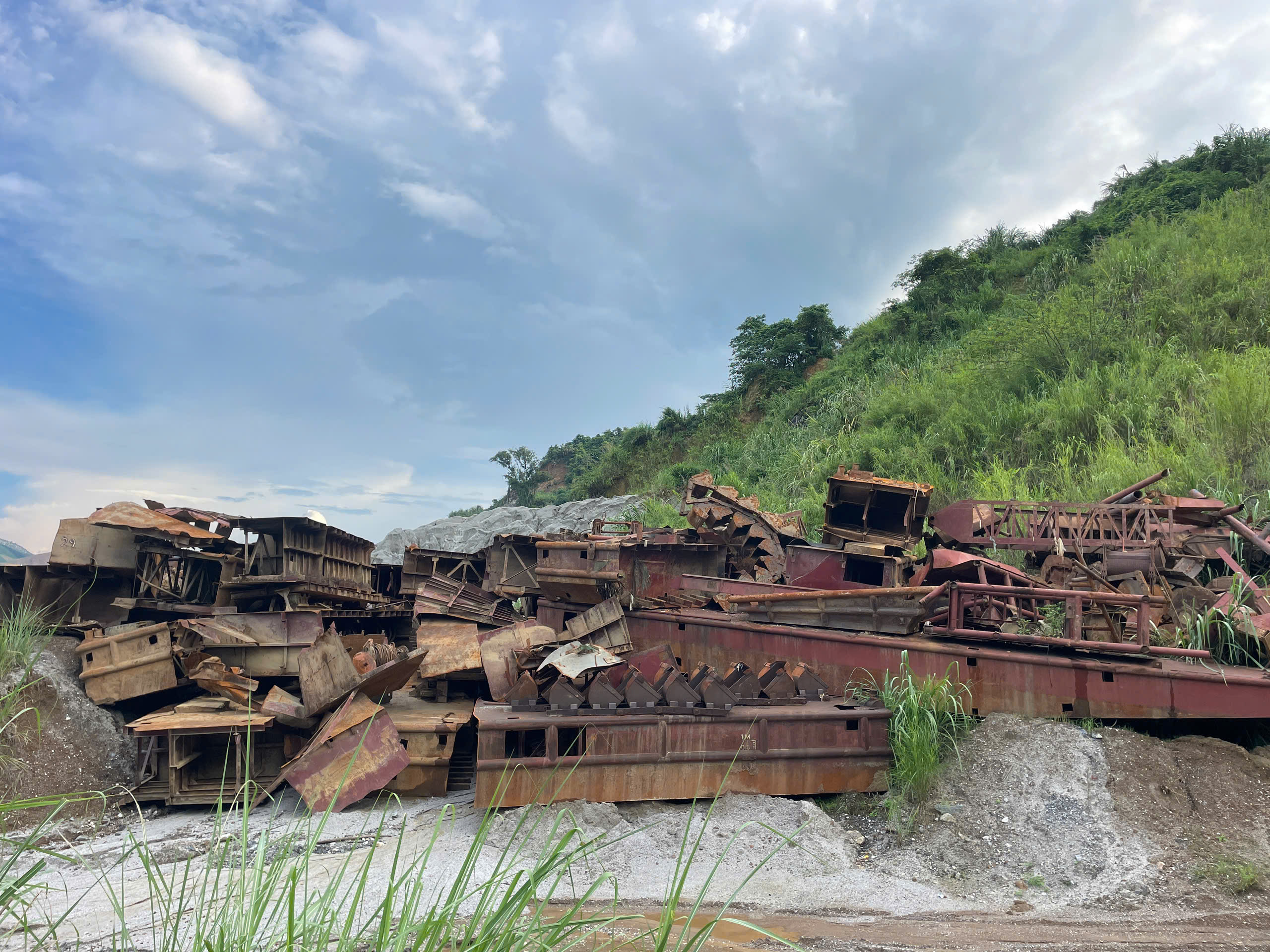 - Đặc điểm, tình trạng: Tài sản đã qua sử dụng, được trục vớt từ dưới sông lên, hiện đang để ngoài trời; đã cắt rời và han gỉ. Tổng khối lượng 243,3 tấn.